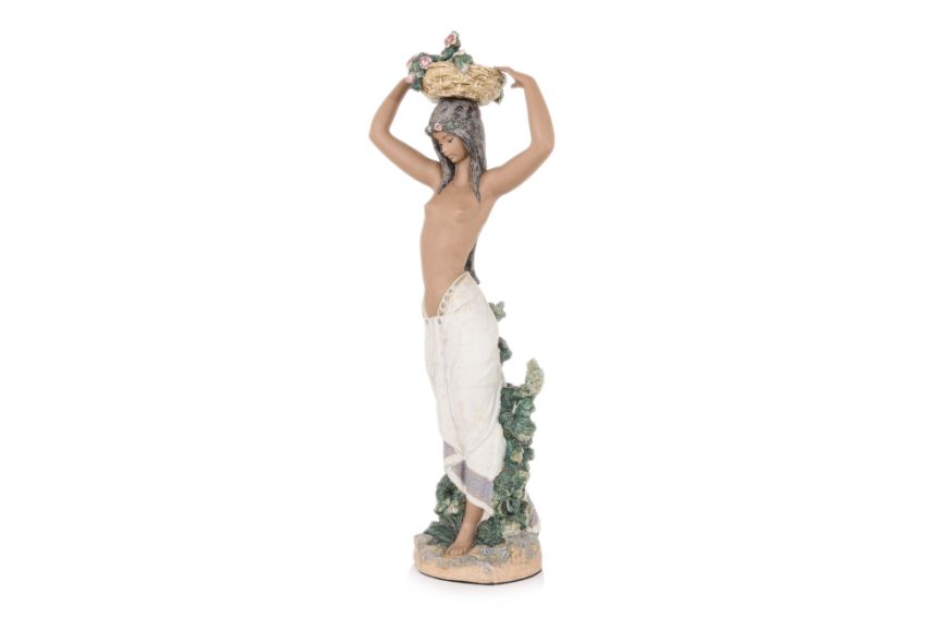 Spanish, modelled as an odalisque woman wearing tunic and holding a basket of flowers over hear head, impressed marks and printed Lladro mark to base, designed by Salvador Debón