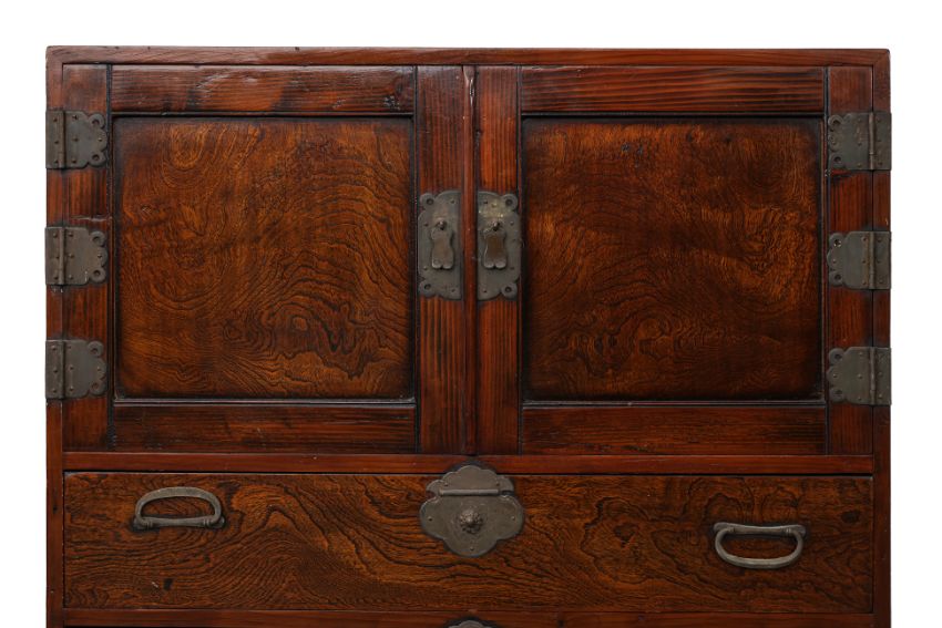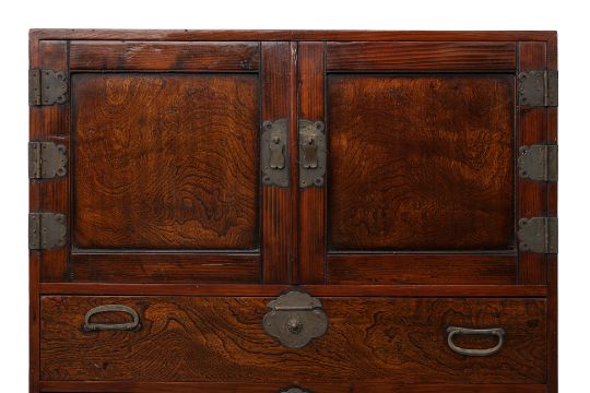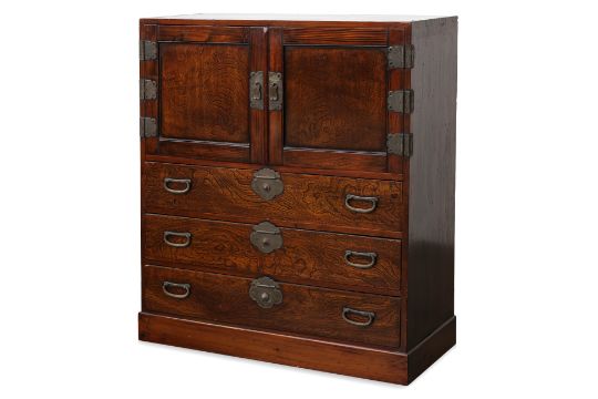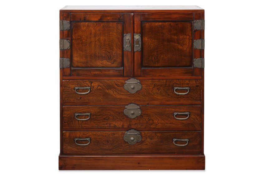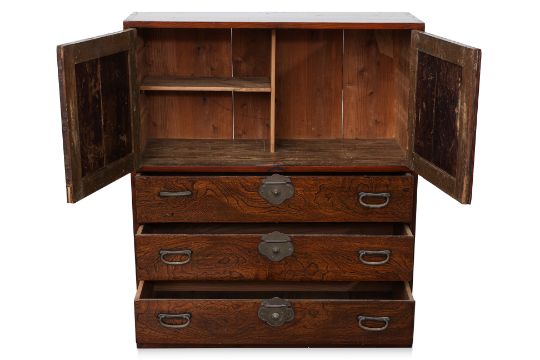 1st half 20th Century, fitted with a pair of cupboard doors above three long drawers, with well figures timbers, brass mounts