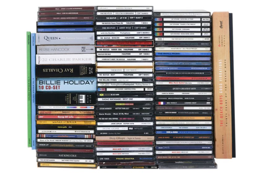 Including many Beatles albums, Dire Straits, Cat Stevens, Miles Davis, Fela Kuti, Beach Boys box set, Queen Platinum Collection, Elton John, Herbie Hancock, Billie Holiday, Cesaria Evora, Bruce Springsteen, Red Hot Cilli Peppers, Charlie Parker Chick Corea, John Coltrane, Janis Joplin, Rolling Stones, Stevie Wonder, and others, approximately 90 in total
