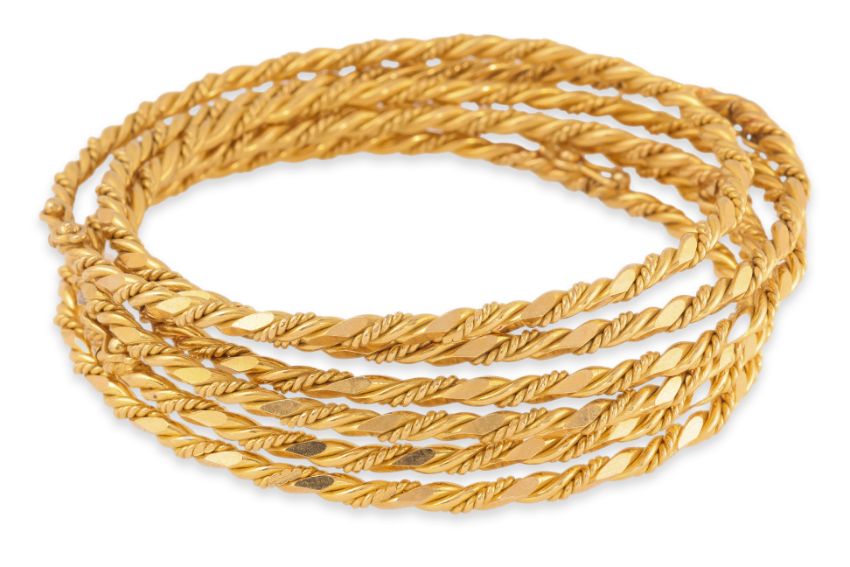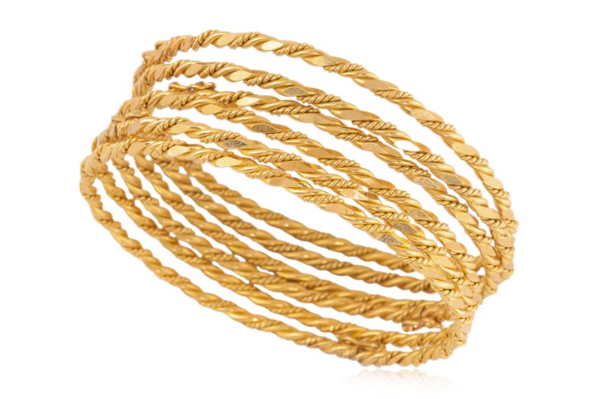 Featuring a group of size high karat gold bangles each marked '916' for 22K, alongside various other marks.
