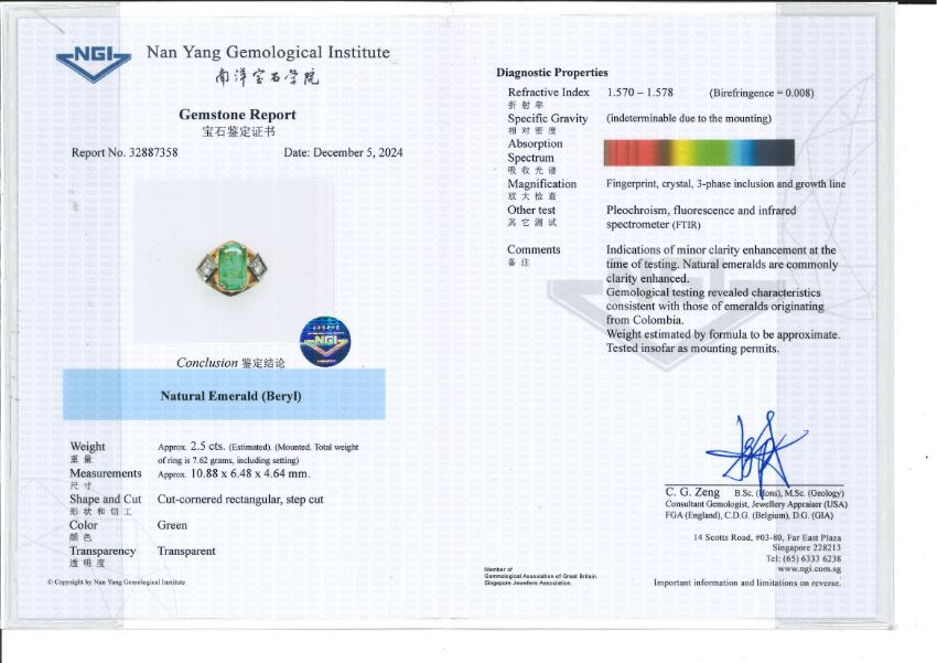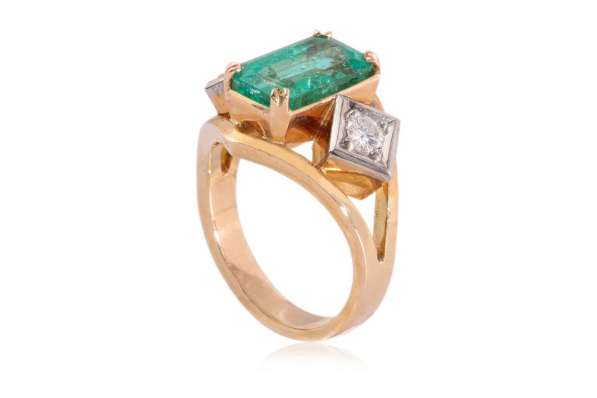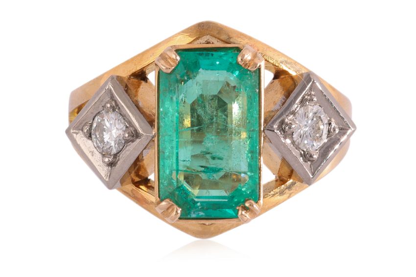 Featuring an emerald cut Colombian emerald weighing approximately 2.50 Cts, mounted in a two tone gold setting marked '18C' for 18K, accented with two round brilliant cut diamonds totalling approximately 0.20 Cts. Accompanied with Nan Yang Gemological Institute Report No. 32887358 dated December 5, 2024, stating that the natural emerald shows indications of minor clarity enhancement at the time of testing, natural emeralds are commonly clarity enhanced and geological testing revealed characteristics consistent with those of emeralds originating from Colombia.