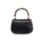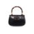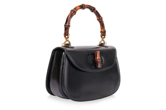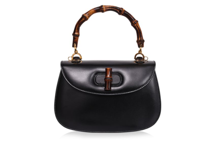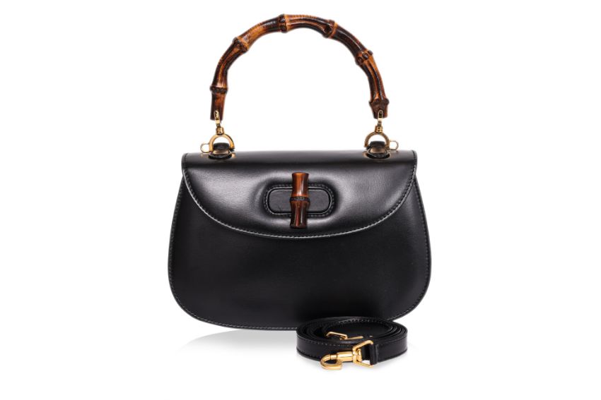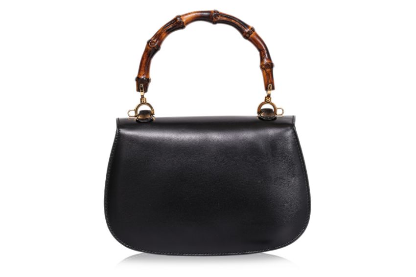 Black leather with curved flap closure, bamboo turn-lock clasp, gold-tone hardware, detachable leather shoulder strap, structured silhouette, red leather-lined interior with zippered and slip pockets., accompanied by pocket mirror and dustbag