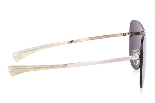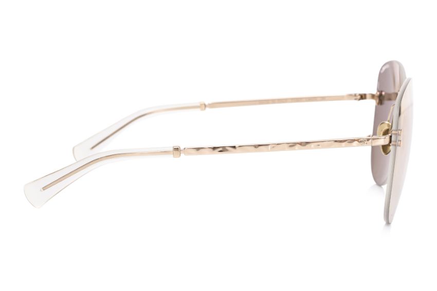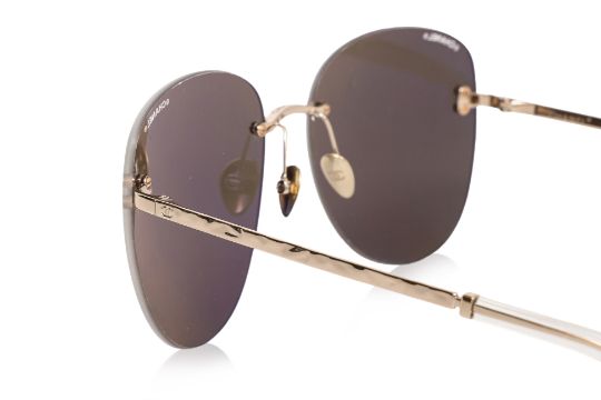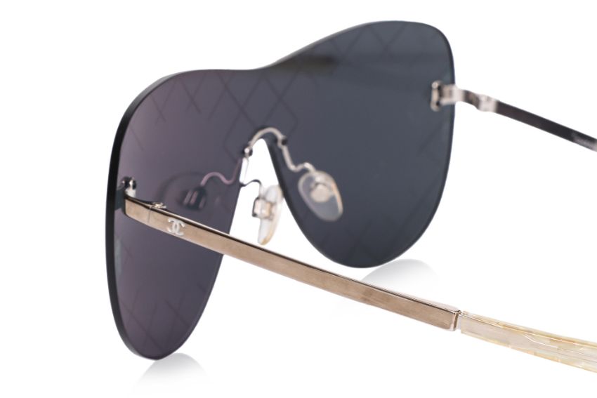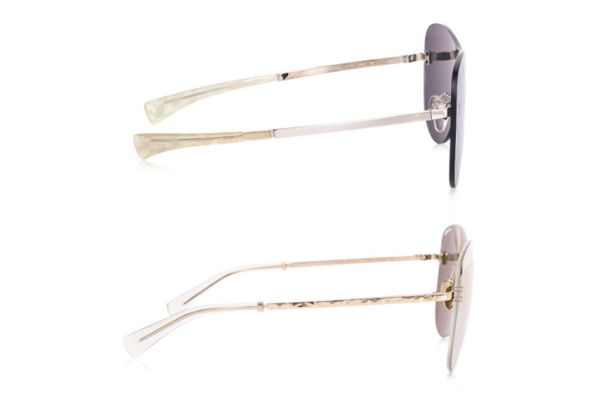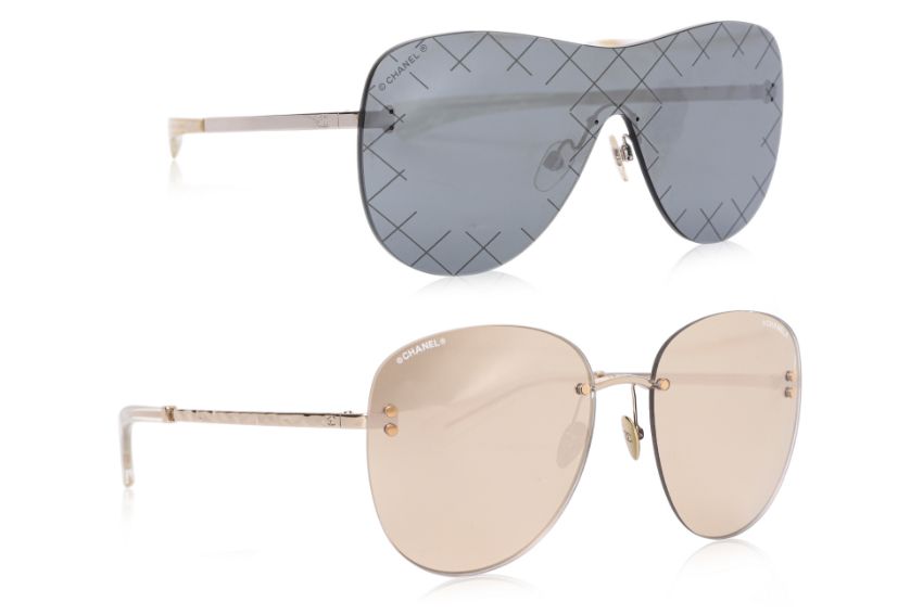 Including a pair of rimless aviators with gold mirrored lenses, a lightweight metal bridge, and hammered metal temples with CC branding (Ref. 711588); the other a shield design with a single wraparound smoked grey lens, accented by quilted etching (Ref. 71307)