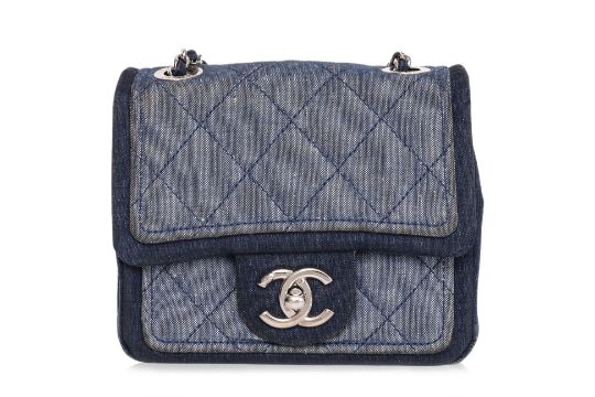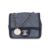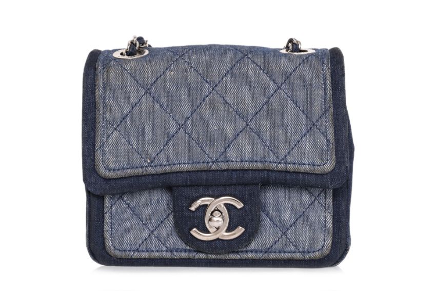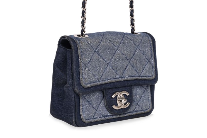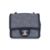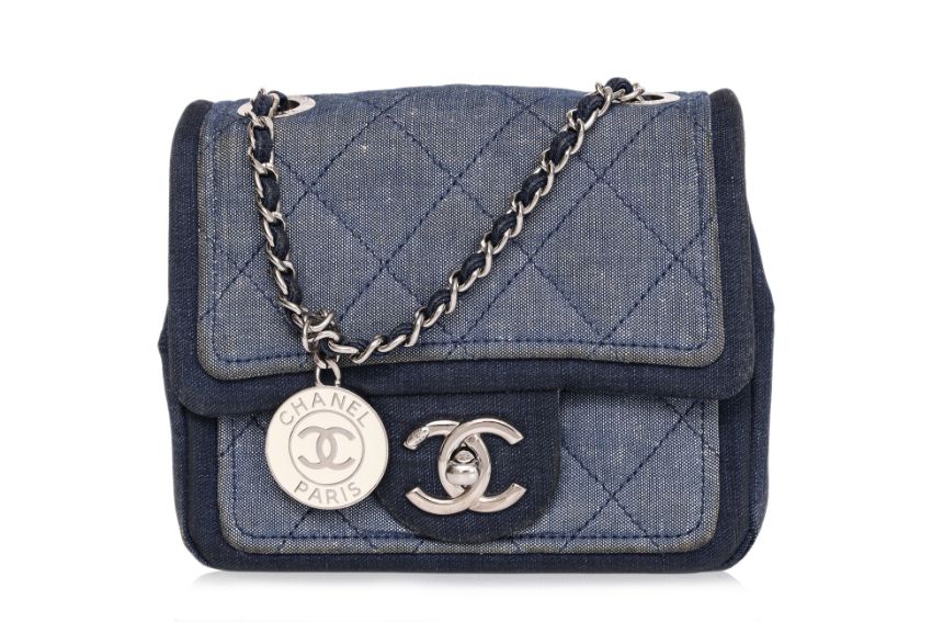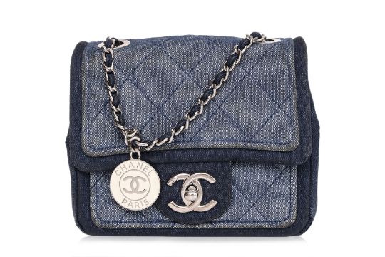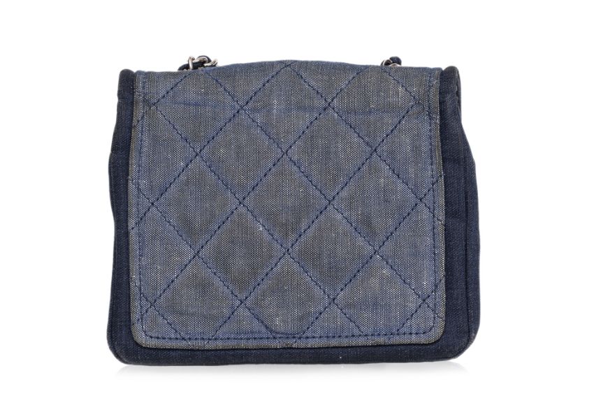 Interwoven chain strap with CC coin charm, CC turn-lock closure, silver-tone hardware, denim-lined interior with a center compartment, and an additional front pocket