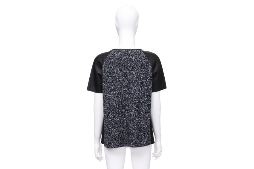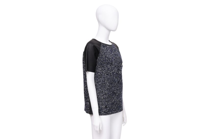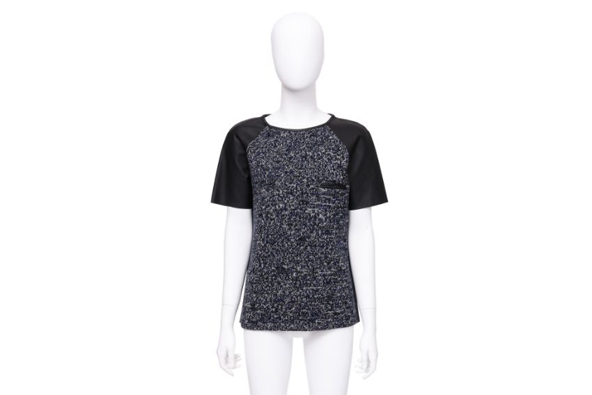 Constructed with a knit body, short leather raglan sleeves, and single zip pocket at the chest