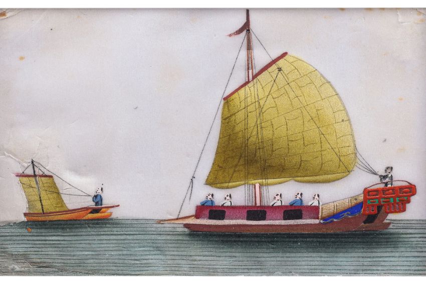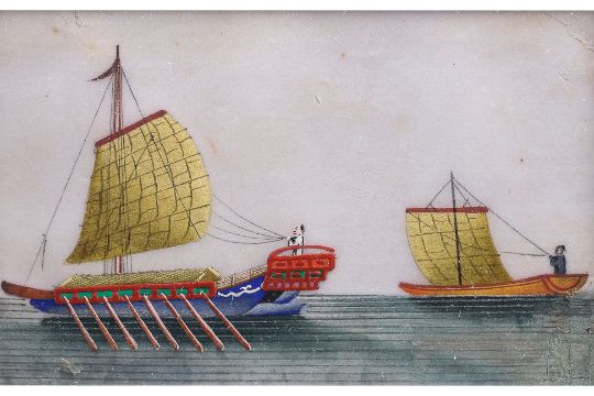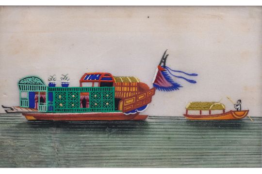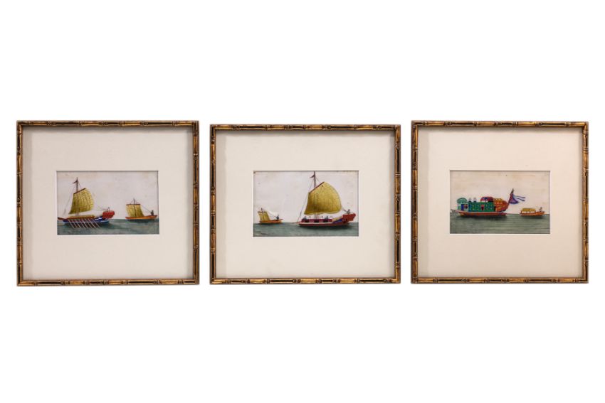Ink and colour on paper, a Kua Hsing 'Revenue Cruiser', a 'Pleasure Boat', and a 'Passage Boat', alongside small boats, circa late 19th century, in gilt bamboo-form frames