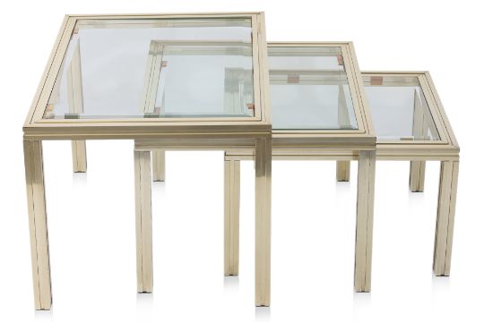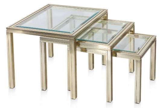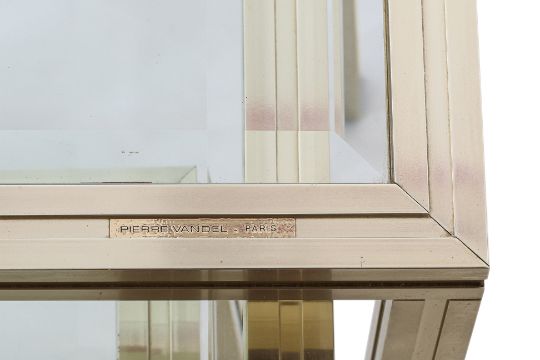 France, two rectangular and one square example, all with fluted brass alloy frames and bevelled glass top, 'Pierre Vandel Paris', label to the larger example
