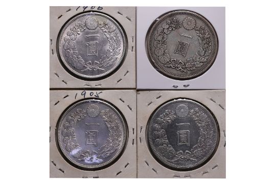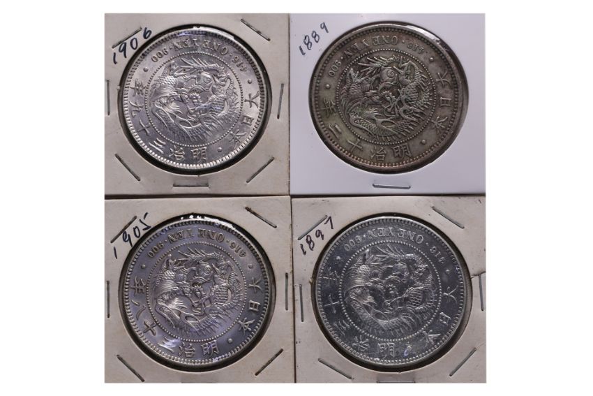 Dragon within a beaded circle, legend in English and Japanese, reverse with chrysanthemum flower and Japanese characters within ribbon tied wreath