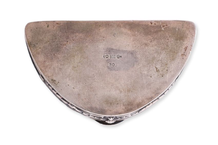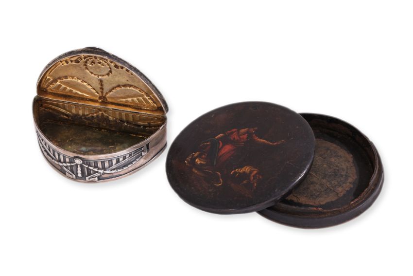 English, circa 1800, circular snuff box and cover, painted scene of lady and children, inscribed 'T.M. Millorn R.I.', an Art Nouveau silver crescent shape box with hinged cover, parcel gilt interior, German 800 silver standard mark to base