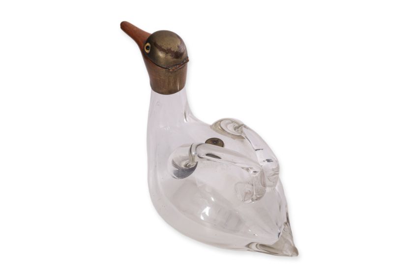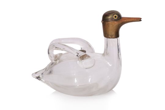 Circa 1900, metal mounted head with glass eyes, hinged cover and inside stopper, the glass body with wings forming the handle
