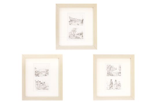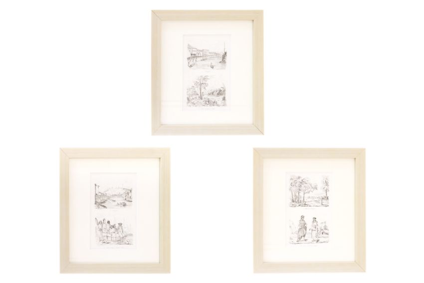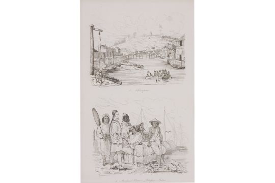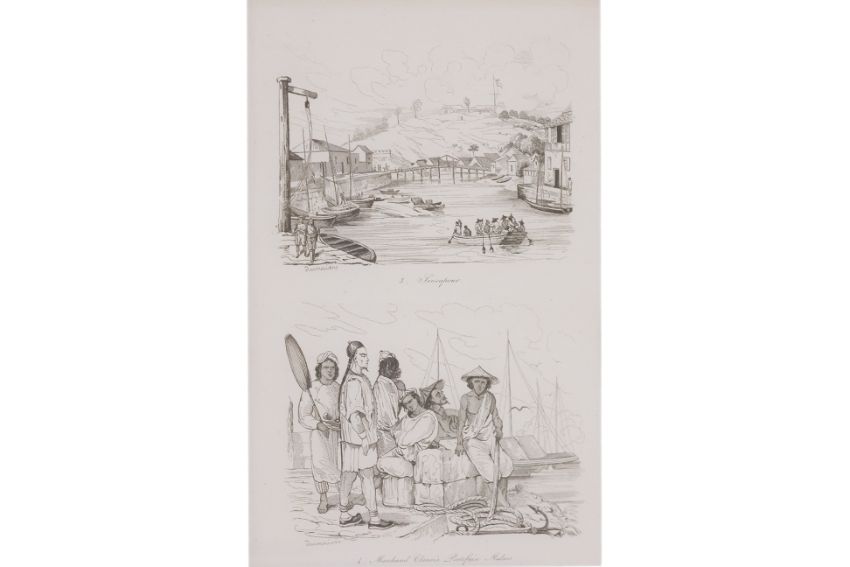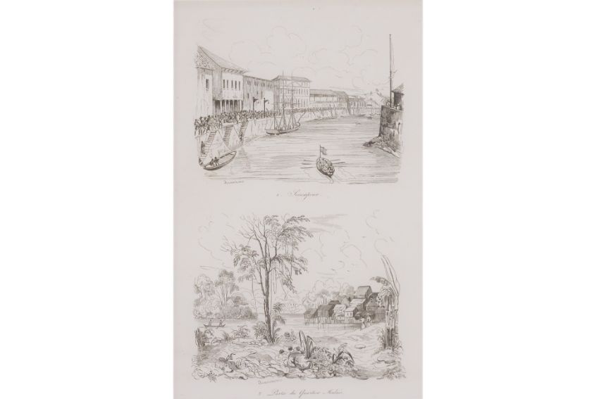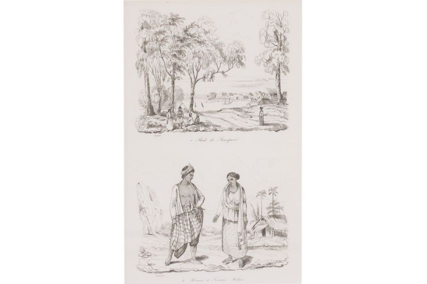 From Voyage Pittoresque Autor Du Monde, published by Tenre' Dupuy, Paris, by M. Dumont D'Urville, 1. Sincapour, 2. Partie du Quartier Malais; 1. Rade de Sincapour, 2. Homme et Femme Malais; 3. Sincapour, 4. Marchand Chinois Portefaix Malais