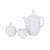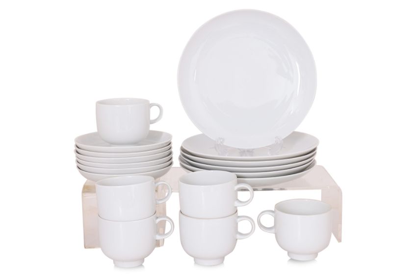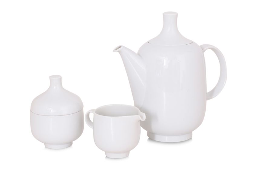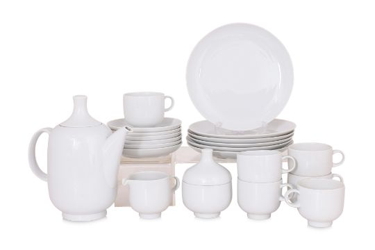 Germany, Mid 20th century, white porcelain, teapot, sugar jar and cover, milk jug, six tea duos and a six side plates, with green Rosenthal studio-line mark to base