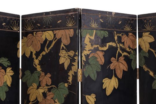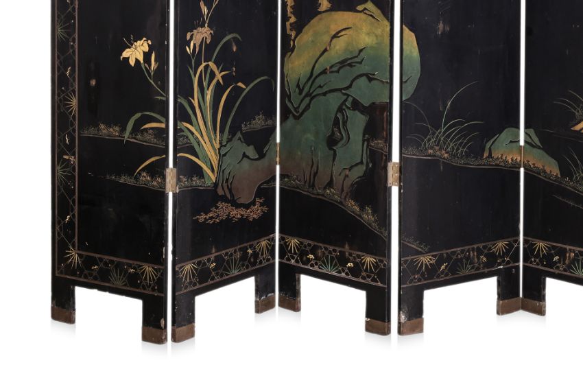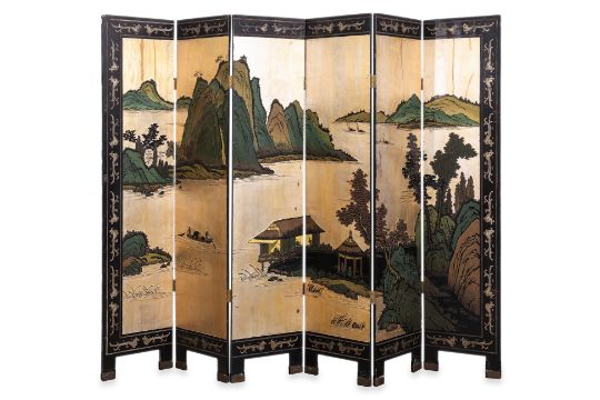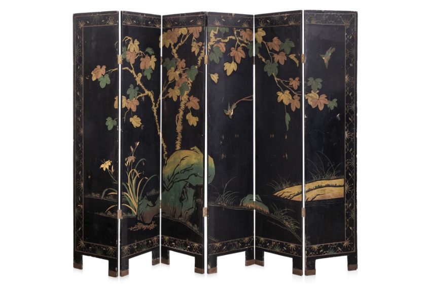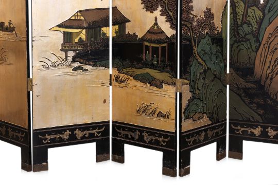 The front decorated in relief carved lacquer, gilding and polychrome, a landscape of lake and mountains with stilt house at foreground, the reverse with trees, flowers and birds, brass capped feet
