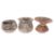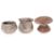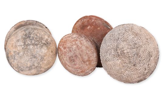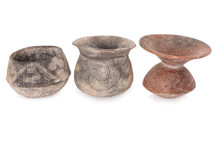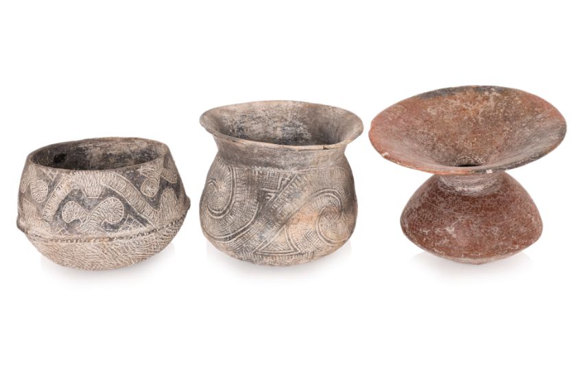 Terracotta, two examples with patterned incised exterior decoration, darkened burnished finish and rounded base, the other with waisted body and wide everted mouth rim
