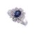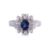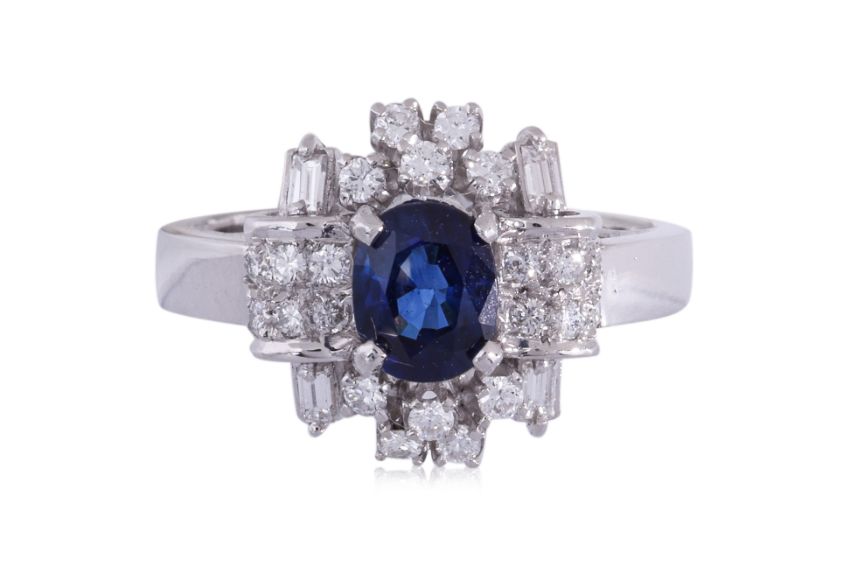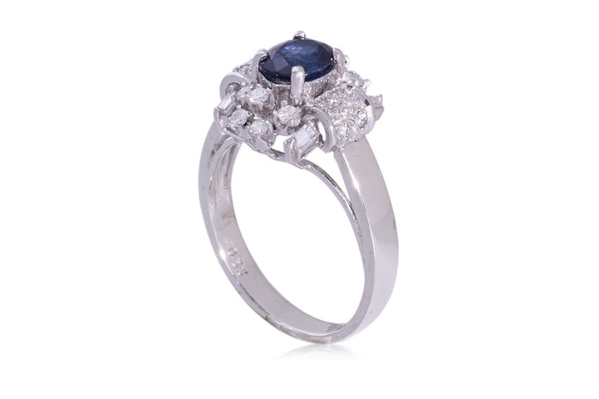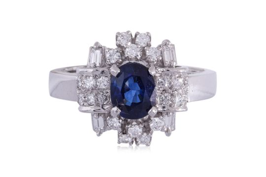 Featuring an oval shaped sapphire weighing approximately 0.80 Cts, mounted in a white gold setting marked '750' for 18K, accented with round and tapered baguette diamonds totalling approximately 0.35 Cts (marked).