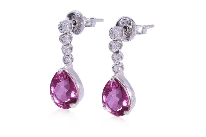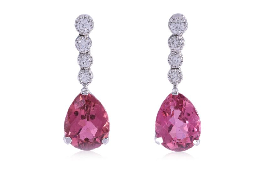Featuring a pair of pear shaped pink tourmalines weighing approximately 2.66 Cts, mounted in a white gold setting marked '750' for 18K to the stud backings, accented with round brilliant cut diamonds totalling approximately 0.14 Cts.