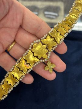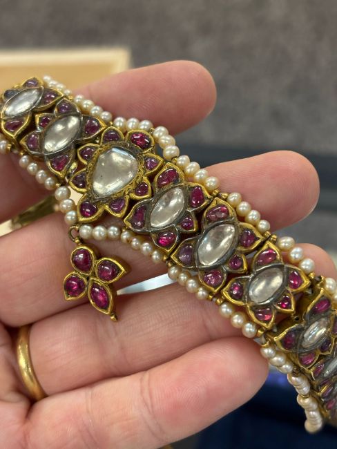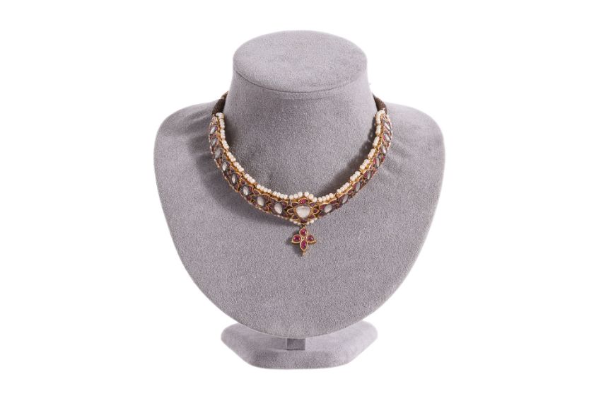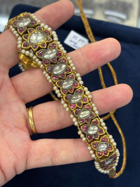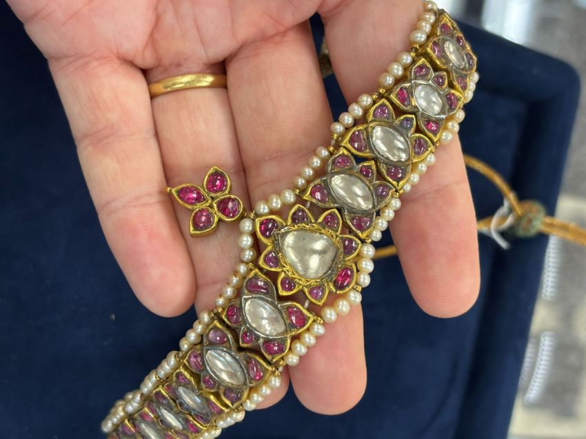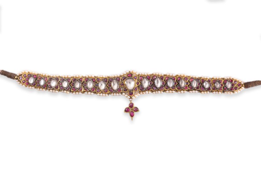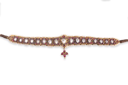 AN ANTIQUE INDIAN WHITE SAPPHIRE, RUBY AND PEARL CHOKER OR HEAD JEWELLERY