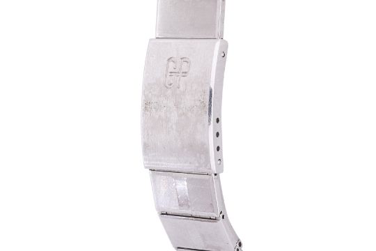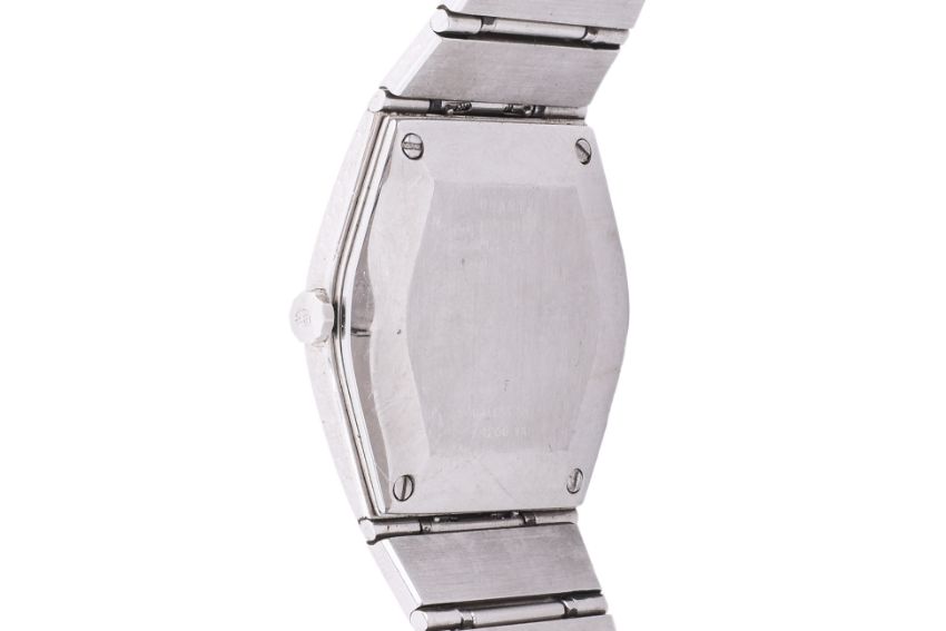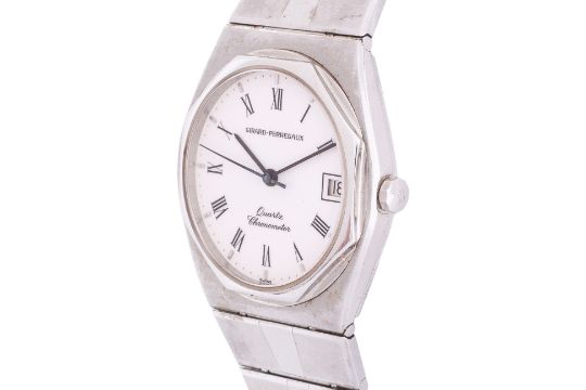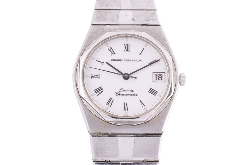 Stainless steel case and bracelet, white dial with Roman numerals and date aperture at 3 o'clock, quartz movement