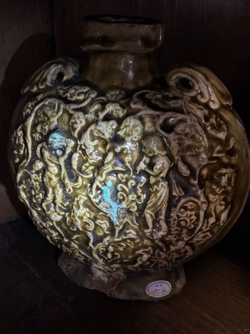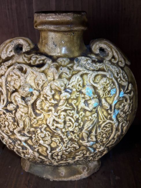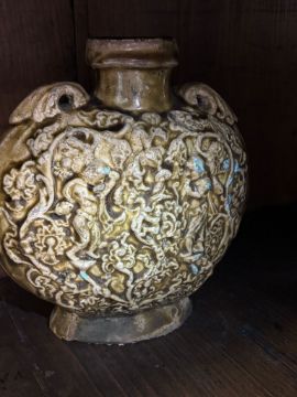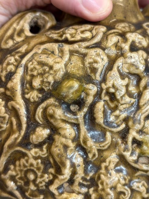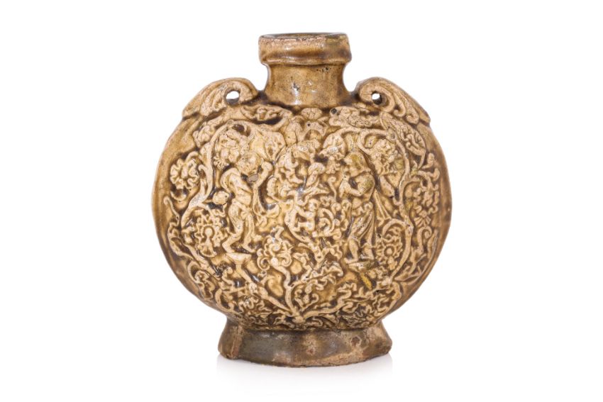 Sui-Early Tang dynasty, compressed circular vessel covered in olive-brown glaze, decorated in moulded scenes of musicians and scrolling vines, lugs to shoulders, on burnished unglazed flat base