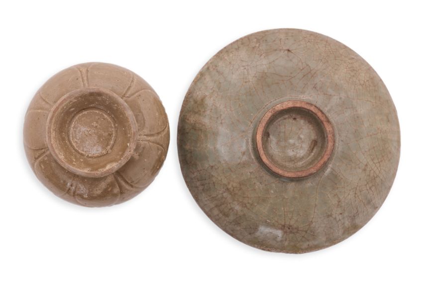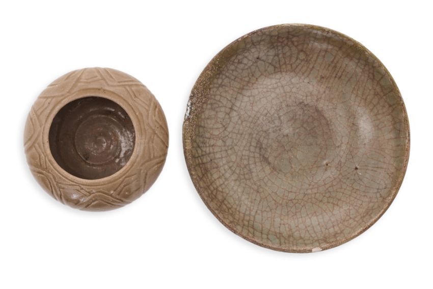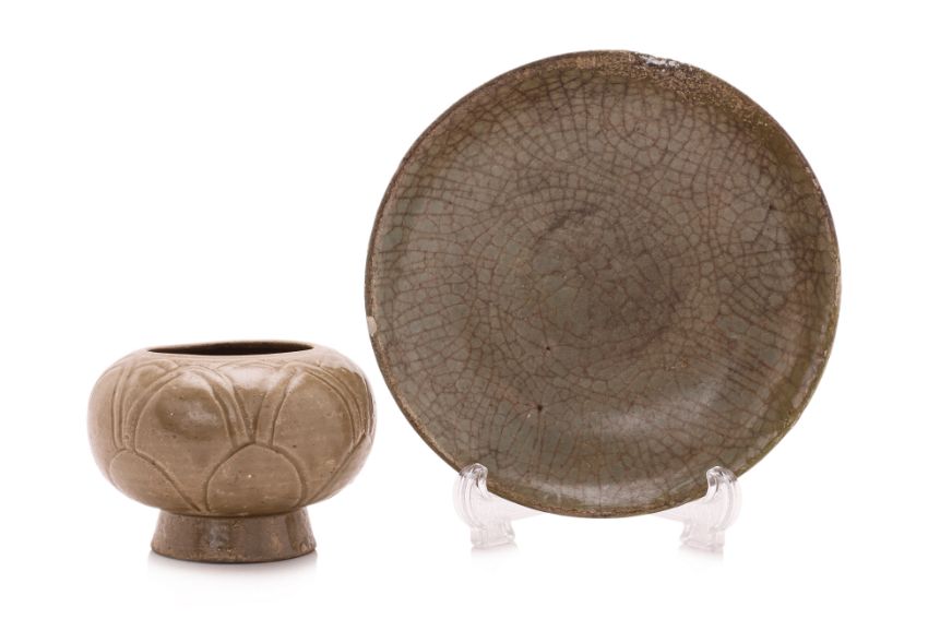 Yuan-Ming dynasty, circular shallow dish with crackle glaze and lobed underside, standing on a narrow raised foot, and a compressed globular jar covered in olive-green glaze, decorated in carved underglaze petals and standing on an everted foot