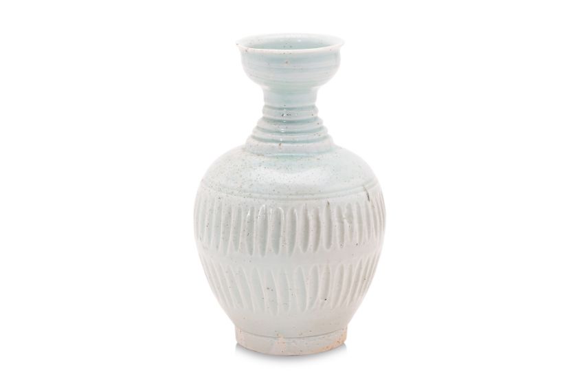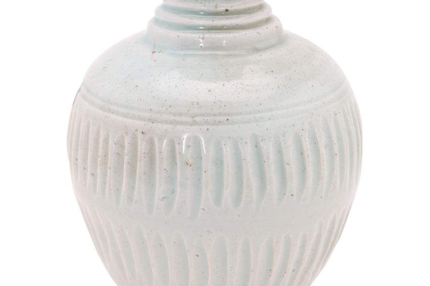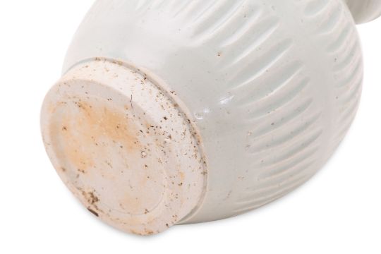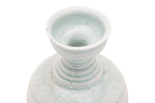Song-Yuan dynasty, oviform body with ridged waisted neck and cup-like mouth, covered in transparent pale-blue glaze, decorated in moulded bands of vertical fluting, unglazed foot showing fine-grained porcelain body