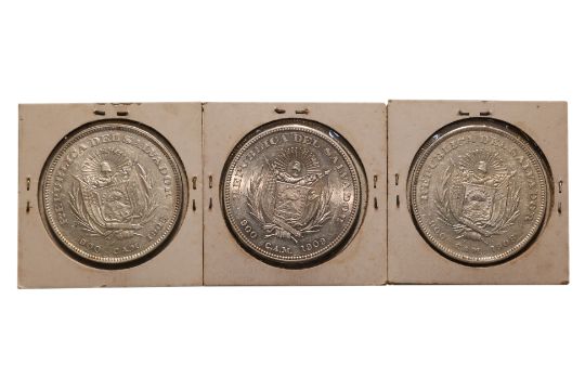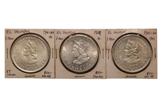 Bust of Christopher Columbus facing left, reverse with national coat of arms with date and mint below, comprising: 1908 (x2), approx XF-AU; 1909 (x1), approx AU-AU+ with some lustre