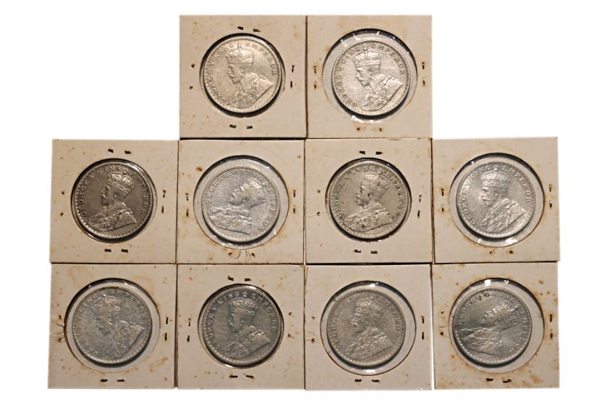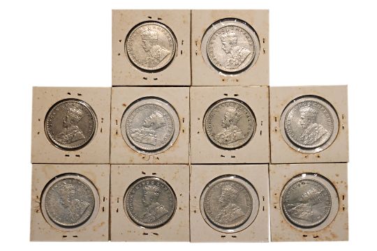 Crowned bust facing left, reverse with denomination and date at centre within a border of rose, shamrock, thistle and lotus flowers, comprising: 1912 C; 1913 C (x2); 1914 B; 1917 C; 1918 B; 1919 C (x2); 1920 C; 1920 B, mostly approximately XF some possibly better