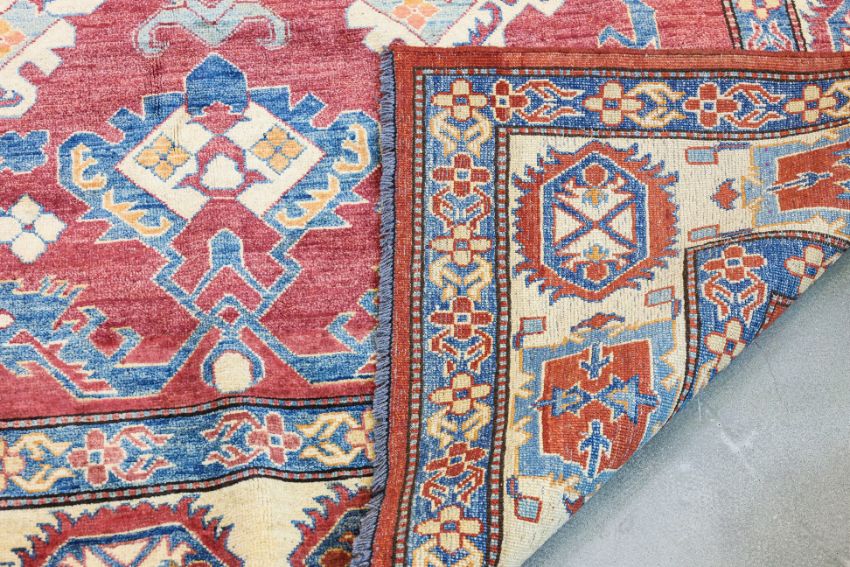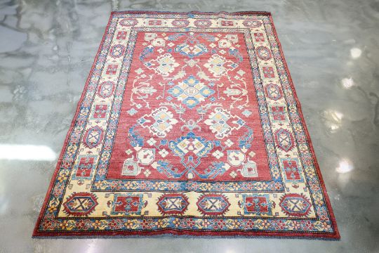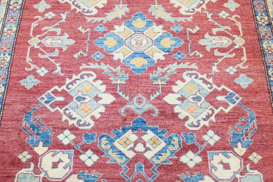Hand knotted wool with a red field featuring central medallions and geometric motifs surrounded by a cream border