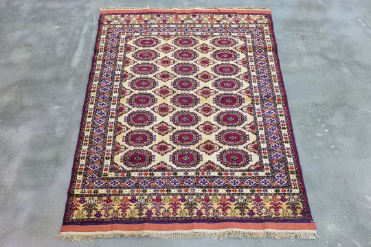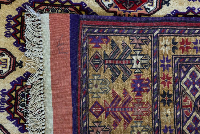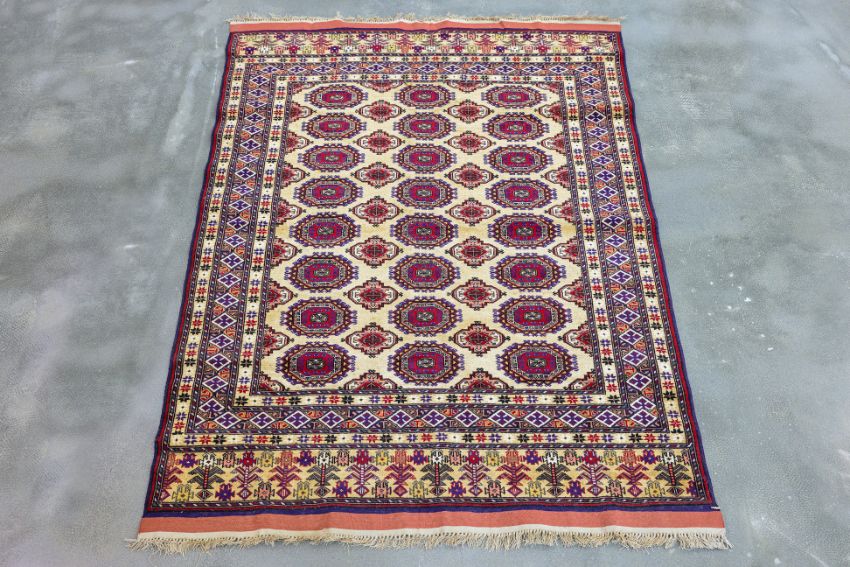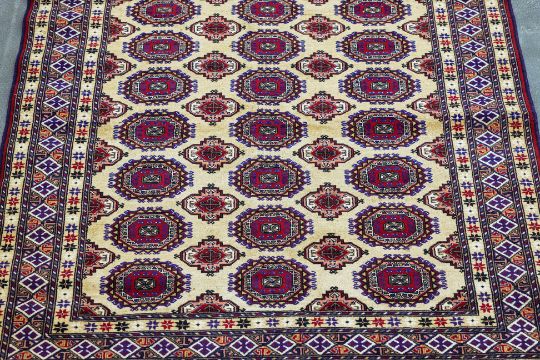 Hand knotted wool with a cream field featuring rows of octagonal guls in red, blue, and purple, surrounded by multi-layered geometric borders