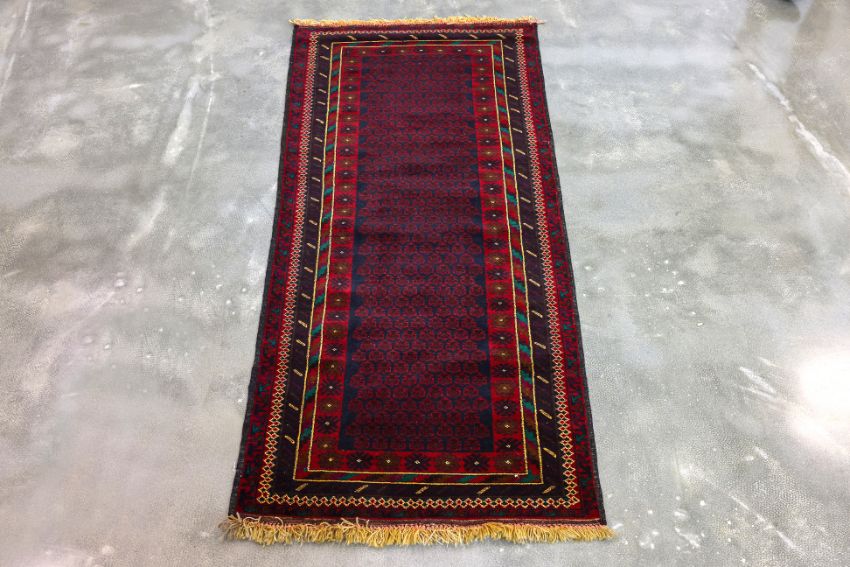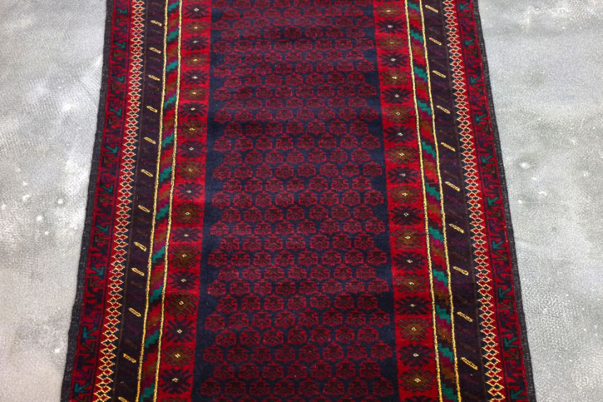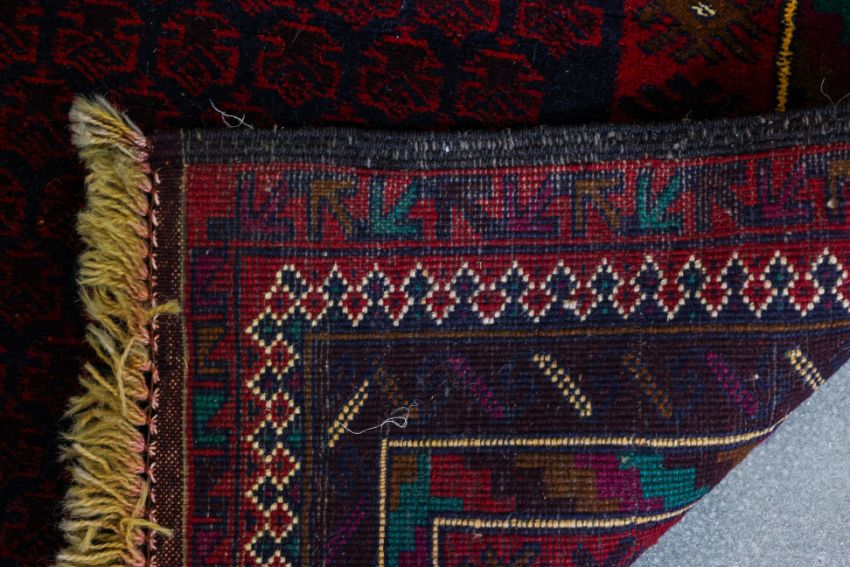 Hand knotted wool pile with a red and indigo field, octagonal gul motifs, starburst rosettes, zigzag guard stripes, and vibrant tribal detailing