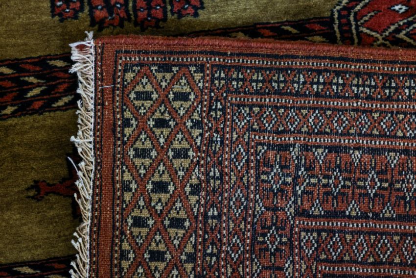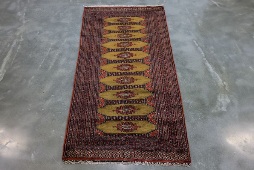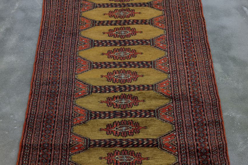 Hand knotted wool pile with a camel ground featuring a central column of repeated octagonal guls, flanked by multiple narrow guard borders
