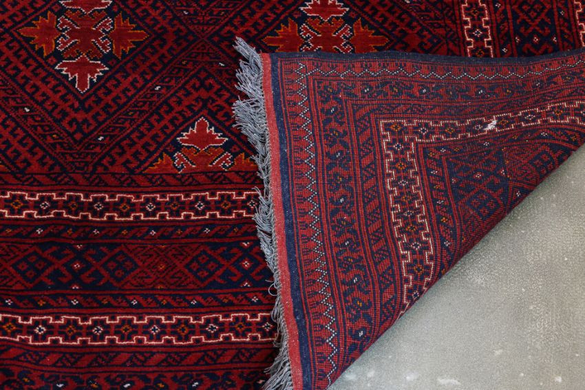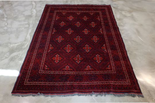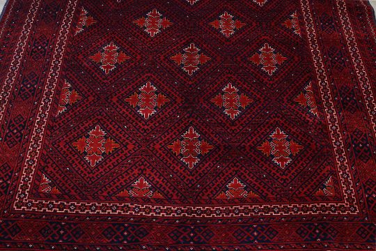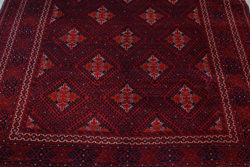 Hand knotted wool pile with a deep red field, featuring a diamond lattice pattern filled with intricate tribal motifs, surrounded by multiple borders of geometric designs