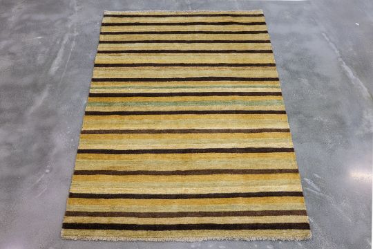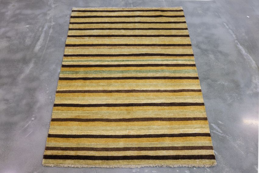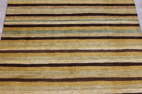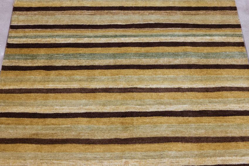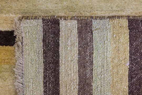 Hand knotted wool pile, striped design in yellow, ochre and brown tones