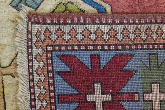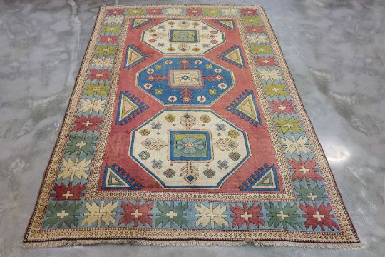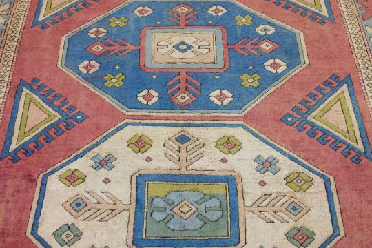 Hand knotted wool with a pale red field, three large geometric medallions, surrounded by angular motifs and framed by a colorful border with starburst patterns