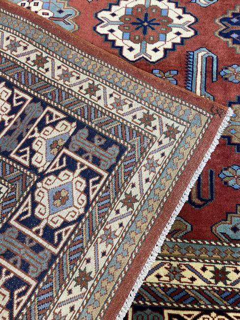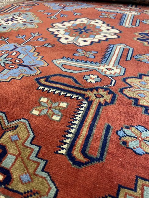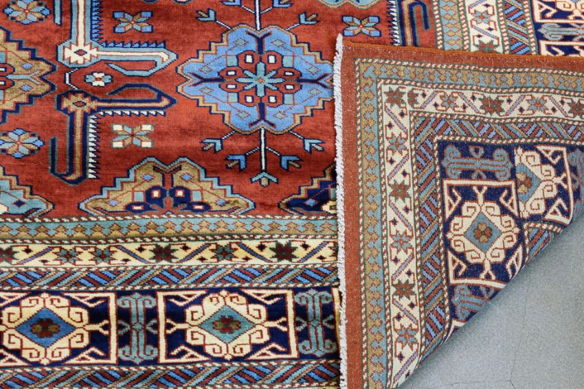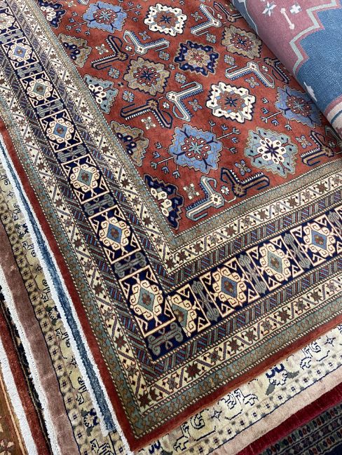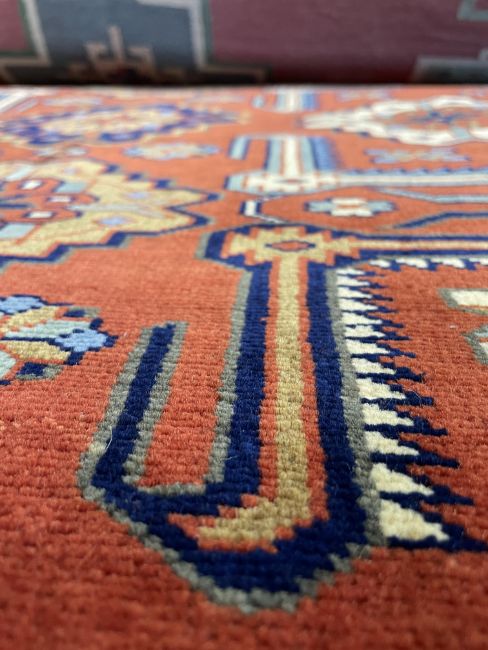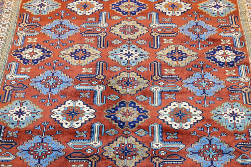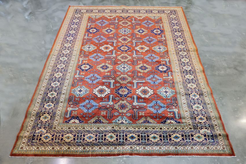 Hand knotted wool pile, a terracotta field with geometric medallions in blue, cream, and yellow, bordered by multi-layered motifs