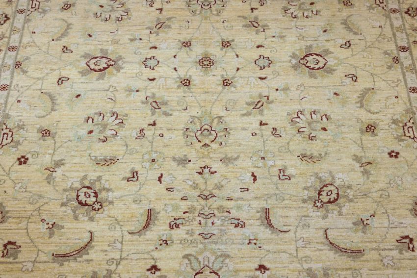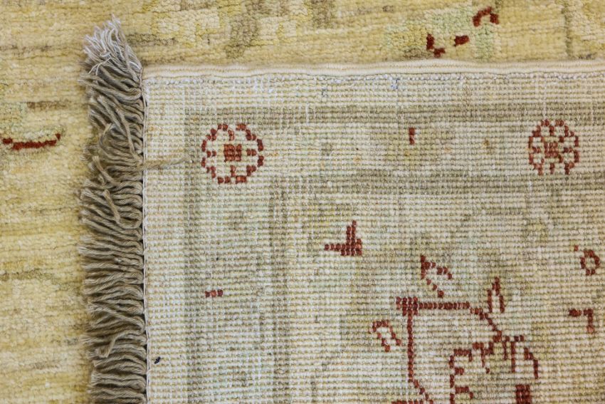 Hand knotted wool with a cream field featuring sparse floral and vine motifs in soft red and taupe tones