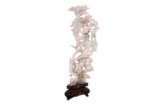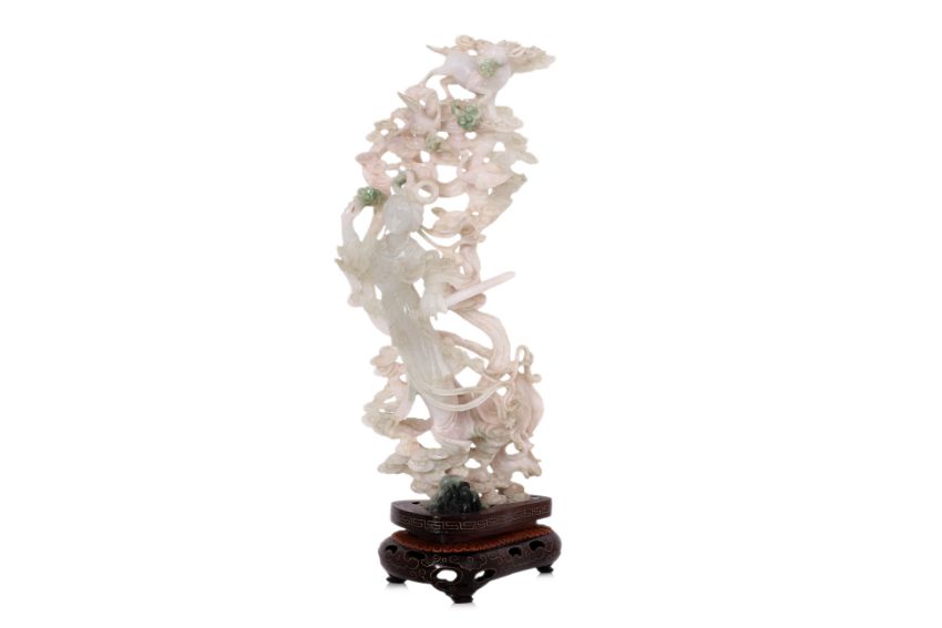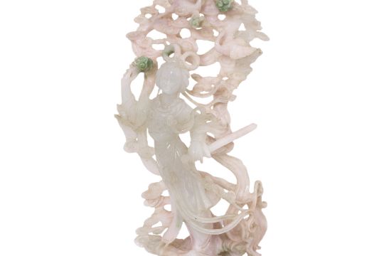 Semi-opaque white jade with green toned areas, modelled standing among clouds, holding a sword, above her are two cranes, ruyi heads and a deer, on a brass inset hardwood stand