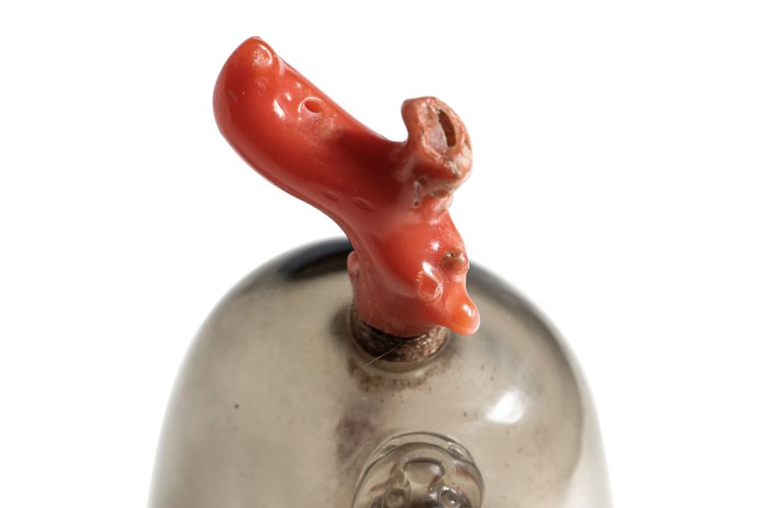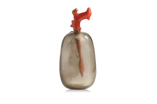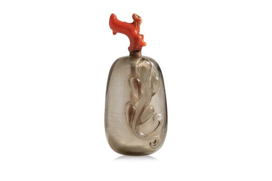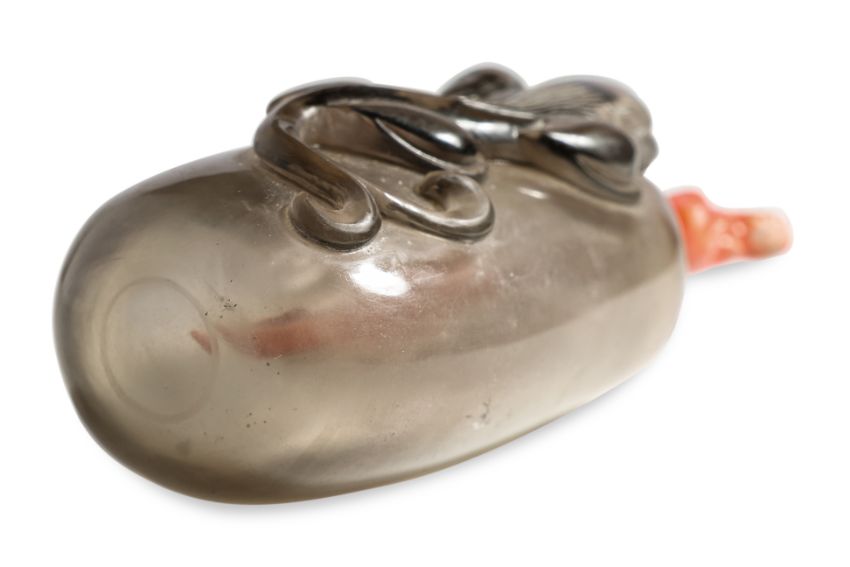 Transparent grey quartz, modelled as a gourd with a climbing chilong, coral stopper and spoon as the stem, well hollowed interior, slightly concave circular base, 19th century