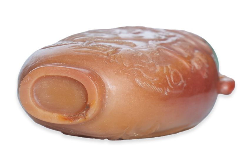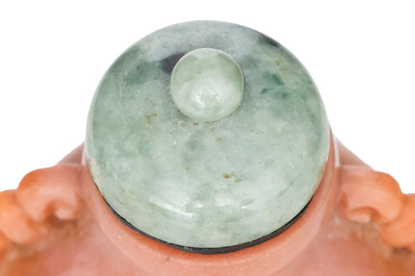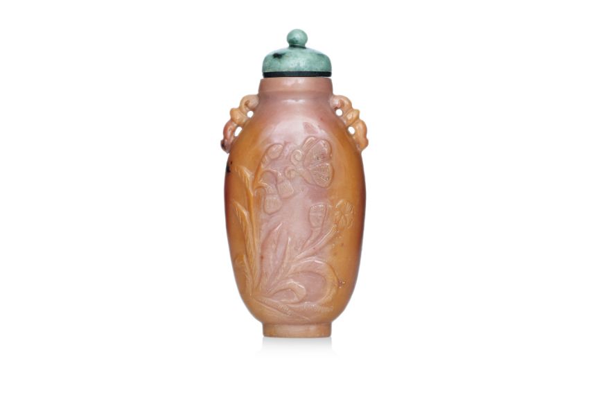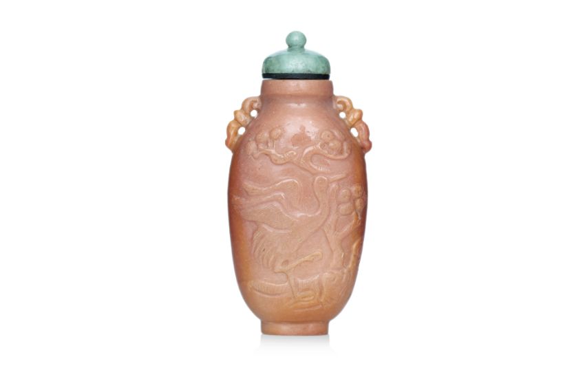 Pink and caramel-red toned soapstone, of compressed slender ovoid form with lugs at shoulders, decorated in relief carved crane and pine tree, butterfly and flowers to the reverse, jade stopper, 19th/20th century