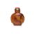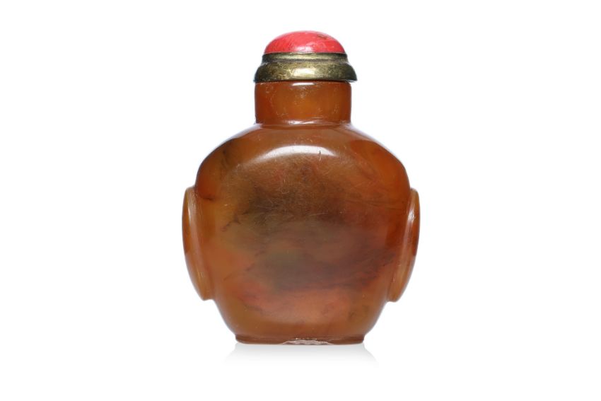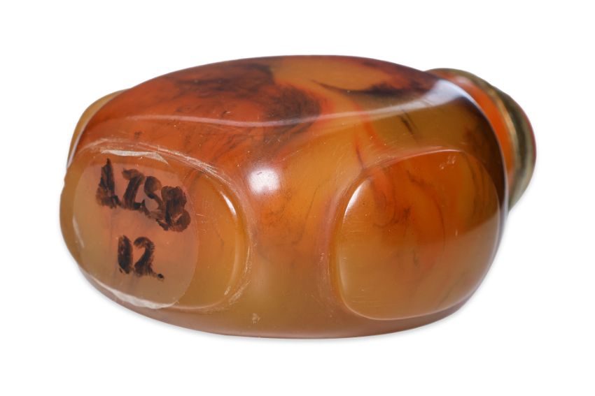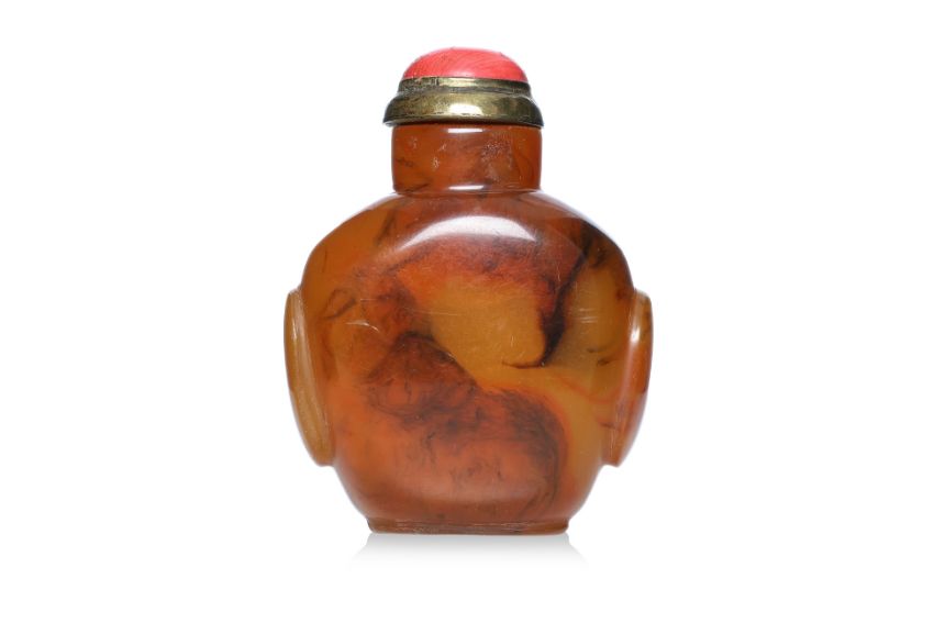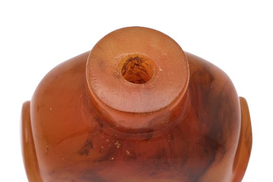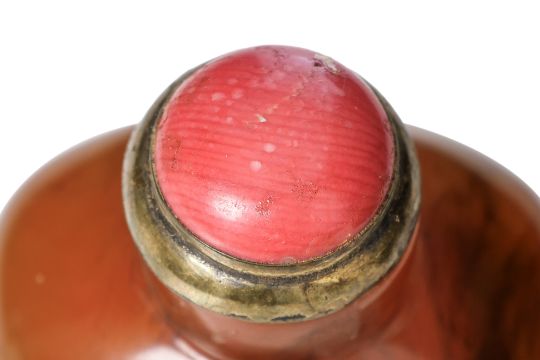 Honey and brown swirled amber, of compressed spade form with protruding panelled sides, standing on a flat oval foot, brass and coral stopper, 19th century
