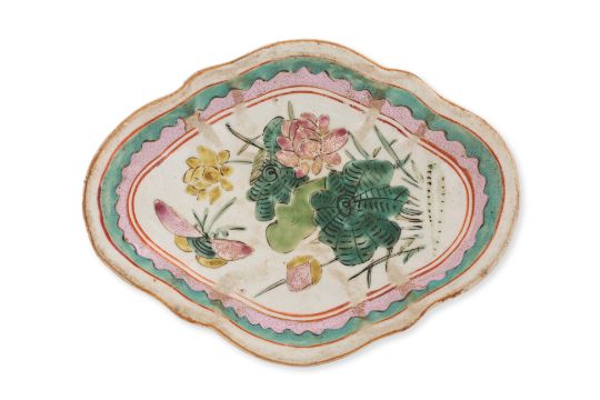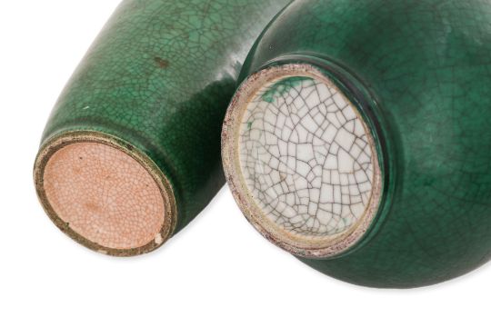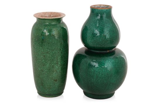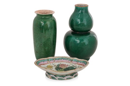 Comprising: a cylindrical vase with flared rim, crackled apple green glaze, late 19th/20th Century; a double gourd example also with similar glaze; and a shaped oval famille rose porcelain dish, late 19th/early 20th Century, decorated with a butterfly and lotus flowers
