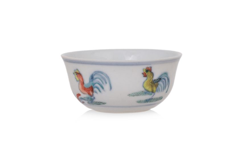 Additional Information: Although a Ming Dynasty prototype, examples from the Kangxi, Yongzheng and Qianlong periods are known, the majority bearing apocryphal Chenghua marks. A Kangxi mark and period example can be found in the Percival David Collection, British Museum, however the design of the scene mirroring the earlier Chenghua models. The present example varies in its design from the earlier prototype, without chicks ,only featuring one group of rocks and the positions of the chickens. A pair of bowls with this matching design variation, from the Christina Loke Balsara Collection, catalogued as Kangxi mark and period, can be found in Arts of Asia, Jan-Feb 1980, Laszlo Legeza, 'Ming and Ch'ing Imperial Tou-ts'ai and Wu-ts'ai Porcelains', Fig.7 & 8