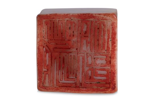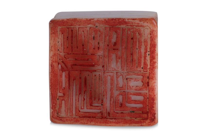 Square form seal decorated with standing mythical bird, four character matrix, with a certificate from Beijing Zhongben Jewelry and Jade Appraisal Centre, Haidian Beijing, identifying the specimen as Hetian jade