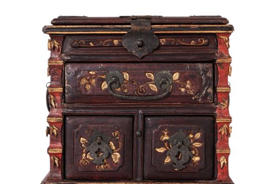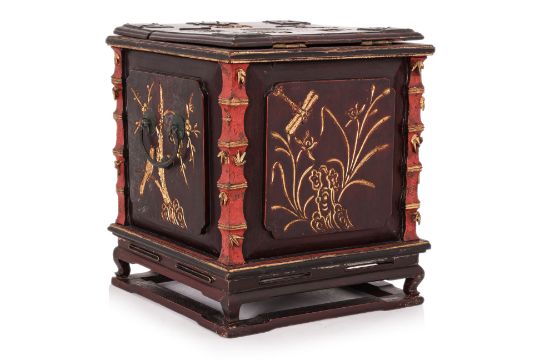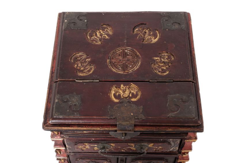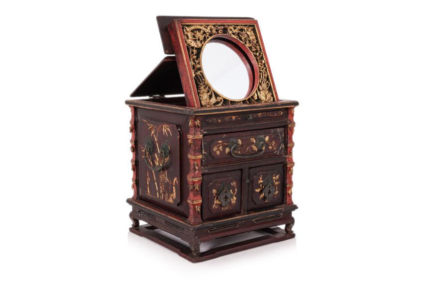 1st half 20th century, the exterior carved and highlighted in gilt with bats, birds and insects amongst bamboo, prunus and other foliage, the hinged cover enclosing a folding mirror with a border of figures riding dragons and phoenixes, bamboo carved frame and fitted with three small drawers