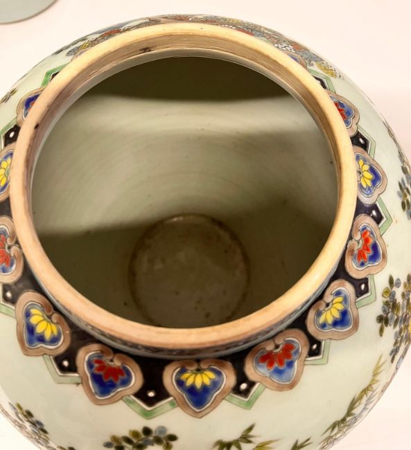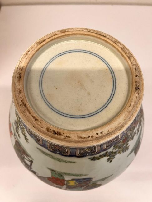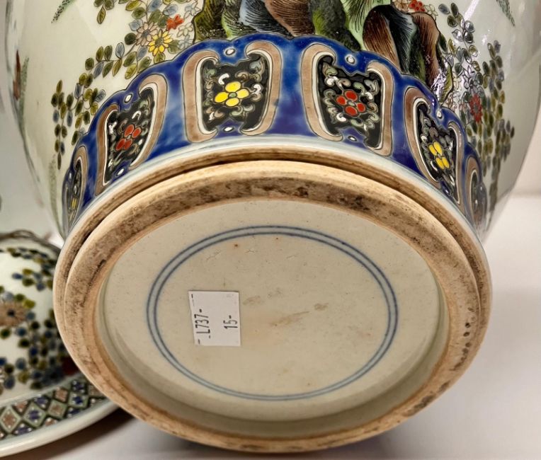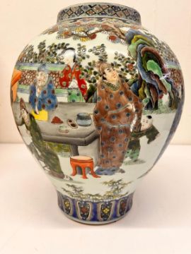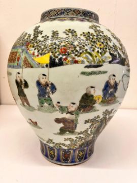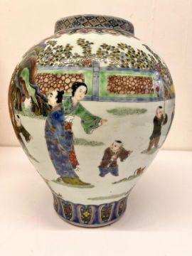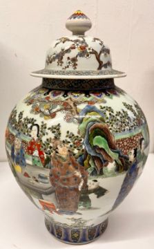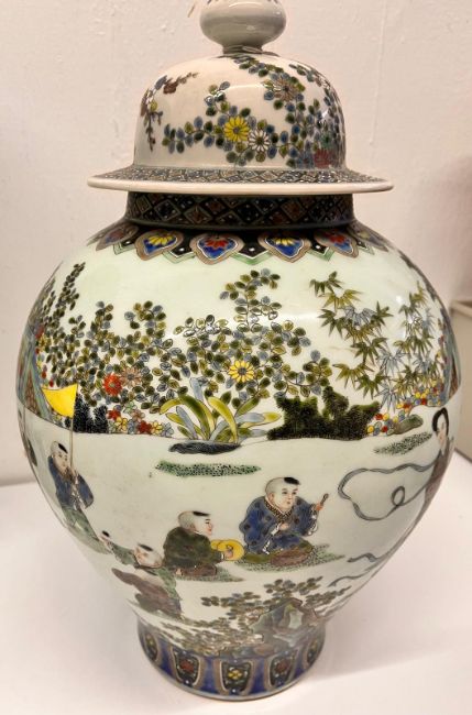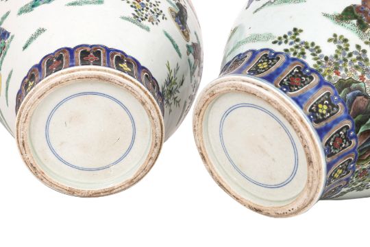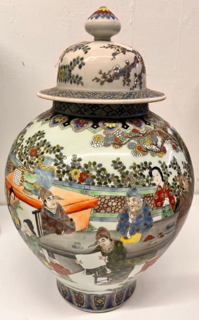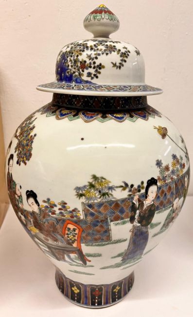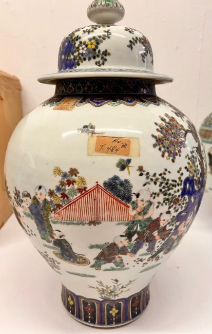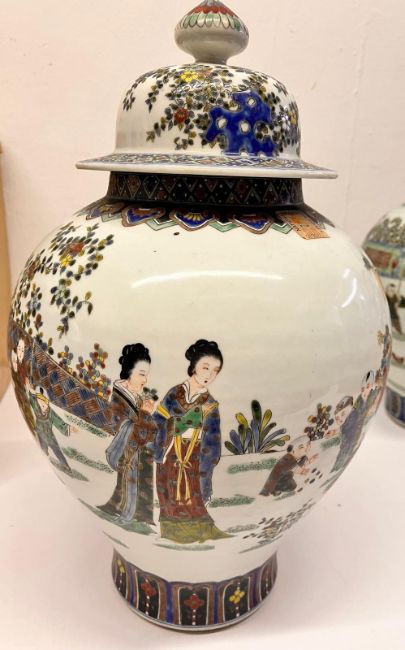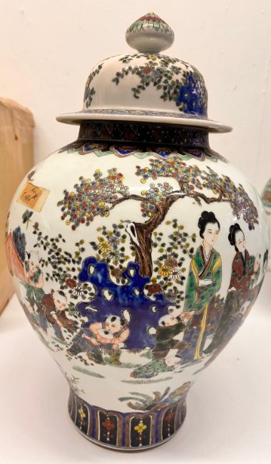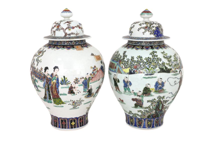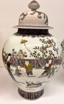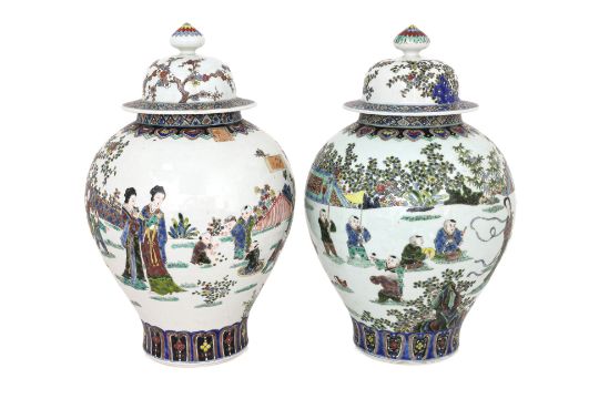 20th Century, baluster form jars, each decorated in continuous garden scene of ladies with boys playing, ruyi head and lappet borders, the domed covers decorated in similar foliage and diaperwork, underglaze blue double ring to base, has National Philippines Museum label
