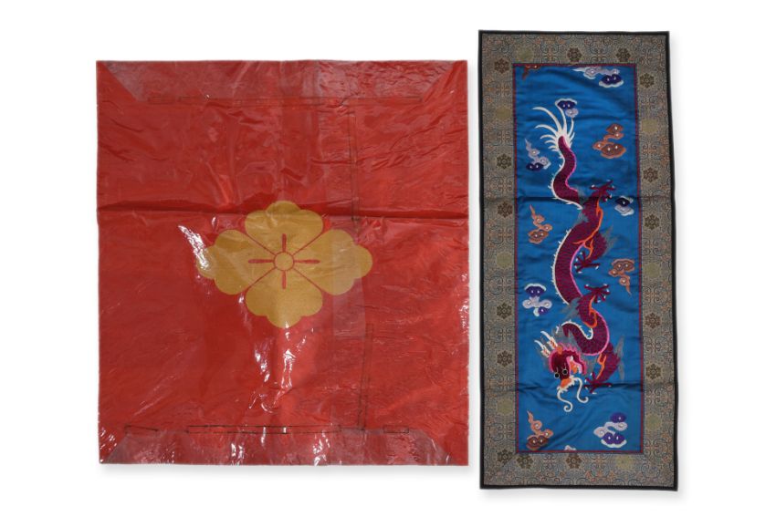 Condition Information: The small peach and bat decorated example has significant tears and loss to the borders