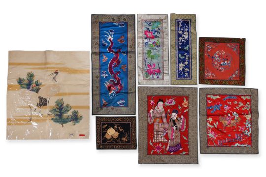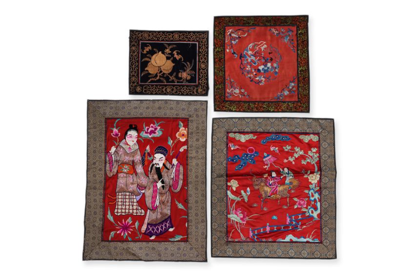 Mostly 1st half 20th century, variously decorated in dragon, pixiu with riders, peaches and bats, flowers and butterflies, and theatre scene