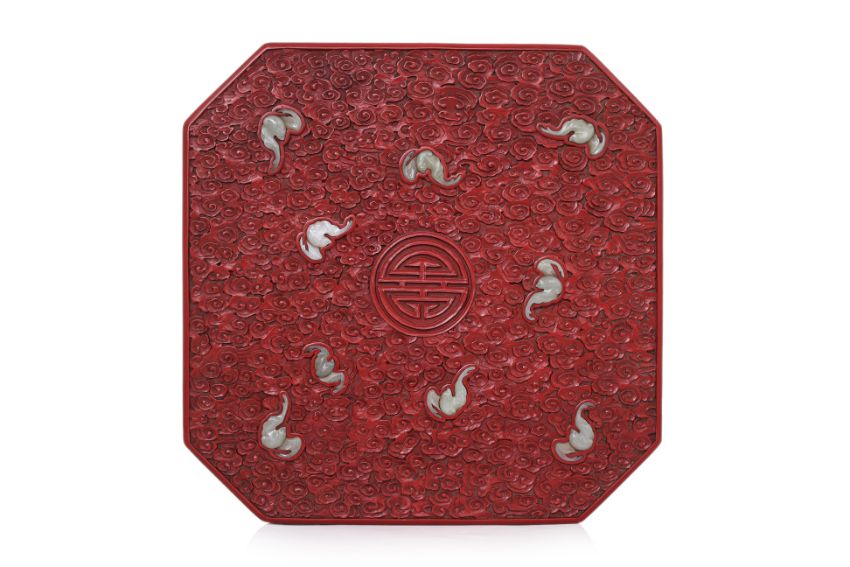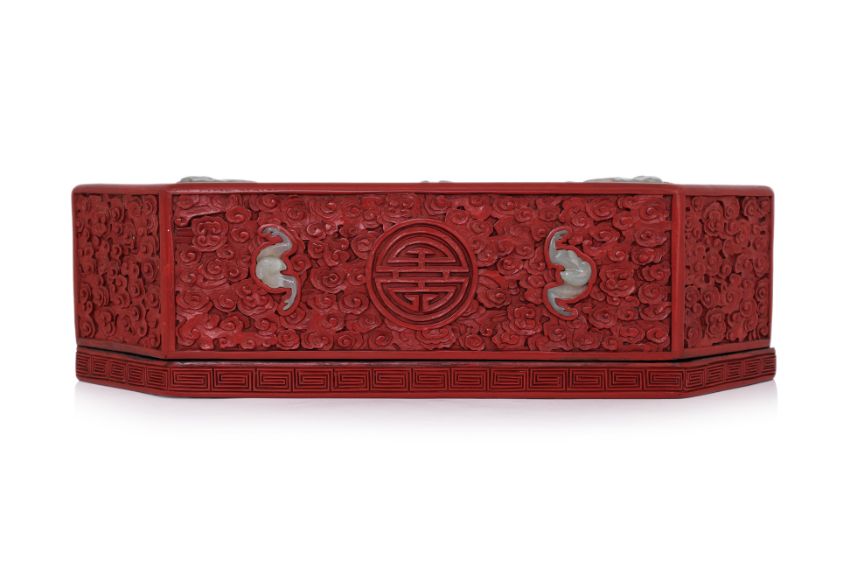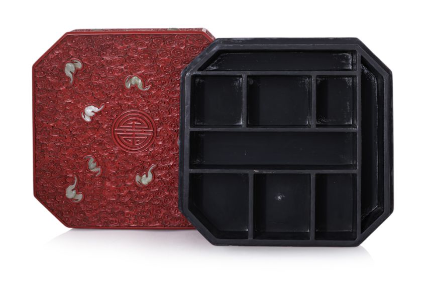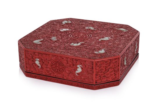 20th Century, square with cut corners, the lift off cover inset with carved jade bats amongst clouds, around a central shou symbol., the sides similarly decorated, black lacquered compartmentalised interior
