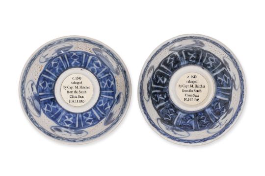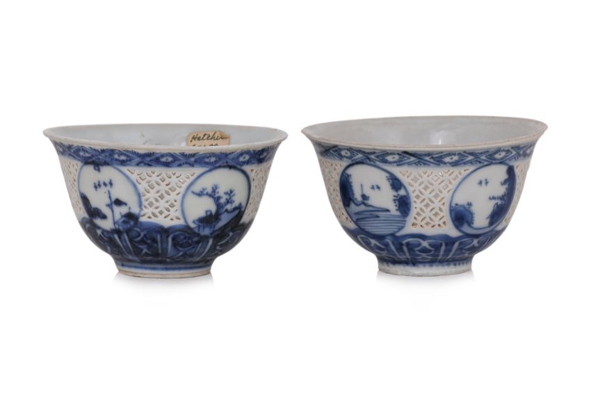Late Ming Dynasty, circa 1640, decorated with five circular landscape medallions, between diaperwork pierced panels, Hatcher labels dated 1985 to base