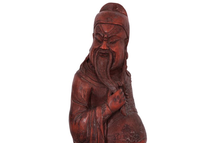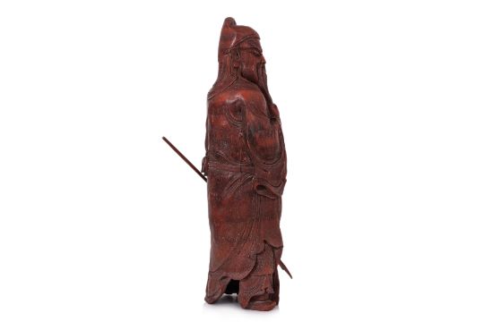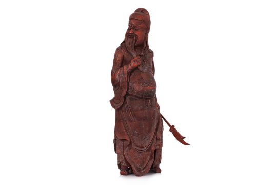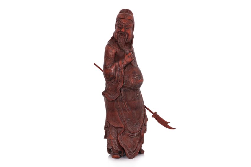 Modelled standing wearing robe, looking over his shoulder whilst stroking his bead, holding a guandao pole-axe, probably 1st half 20th century